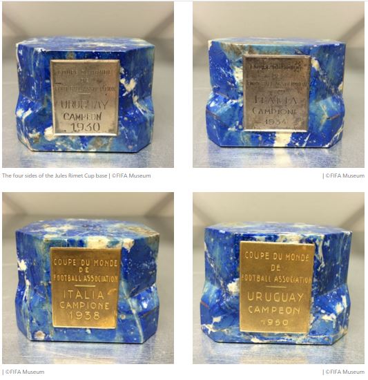 To complicate things, in 2015, the pedestal of the original A Jules was found, of all places, at FIFA’s cellar in Zurich (with five underground levels, was the cellar in the minus six?). With the blue lapis lazuli pedestal they also found the plates engraved with the names of the winners of the four initial competitions: Uruguay (1930; 1950), and Italy (1934; 1938). For whatever reason never explained, someone, never named, had decided to make a new base for the trophy in 1954. The remnants of the apparently original A Jules pedestal are on exhibit at the FIFA Museum. Make of it what you will, but it supports the strangeness of the trophy in Germany.